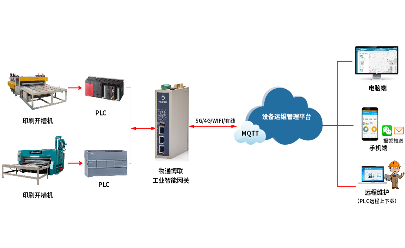 物通博聯利用WG系列工業智能網關作為連接設備和監控系統的橋梁,實現印刷機械設備數據的遠程監控和維護,為印刷企業提供更加智能化的印刷機械設備遠程監控智能運維解決方案。